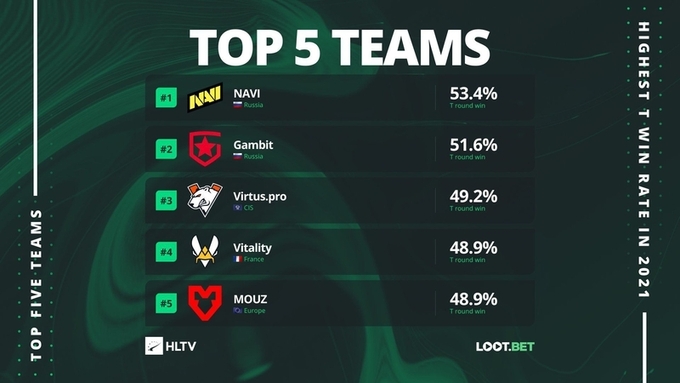 NAVI выигрывали 53% раундов за атаку, на втором месте Gambit Esports (51,6%), на третьем Virtus.pro (49,2%).