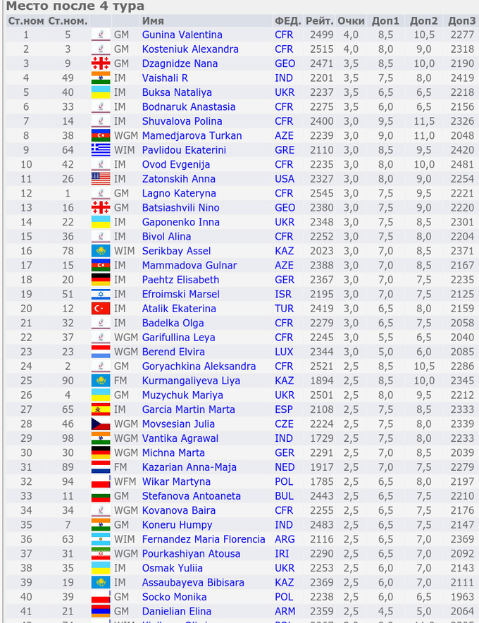 Украинка Наталья Букса набрала 3.5 очка из 4 возможных и делит 3–6 место в турнирной таблице. Инна Гапоненко имеет 3 очка. А вот для сестер Марии Музычук (2.5 очка) и Анны Музычук (2 очка) первый день сложился неудачно. Лидируют Валентина Гунина и Александра Костенюк (по 4 из 4), представители команды под названием ФШР, которая выступает без гимна и флага.