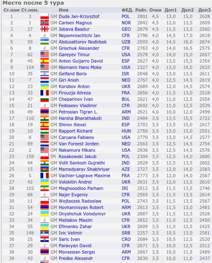 У мужчин после 5 туров образовалась лидирующая тройка: Ян-Кшиштоф Дуда (Польша), чемпион мира Магнус Карлсен (Норвегия) и Баадур Джобава (Грузия) набрали по 4.5 очка из 5 возможных. Среди украинцев лучше других выступают Антон Коробов (4 очка), Андрей Волокитин, Владимир Онищук, Захар Ефименко (по 3.5).