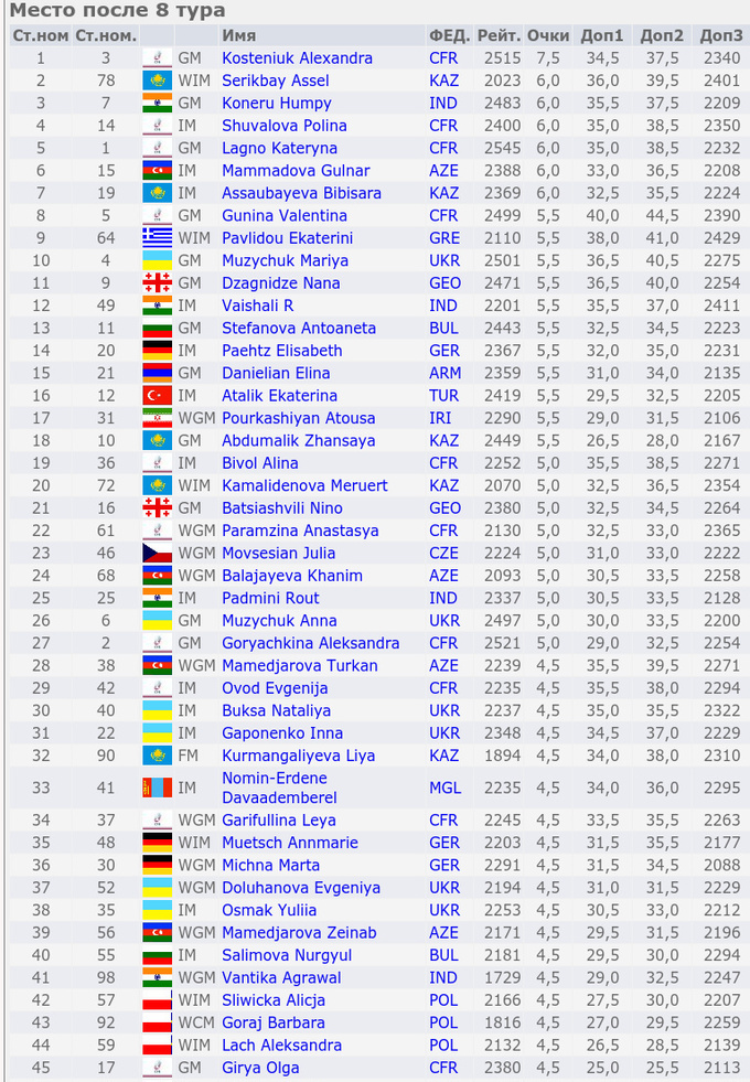 Украинка Мария Музычук набрала 5.5 очков из 8 и входит в топ-10. Ее сестра Анна Музычук имеет 5 пунктов. А лидирует Александра Костенюк (7.5 из 8), представитель команды под названием ФШР.