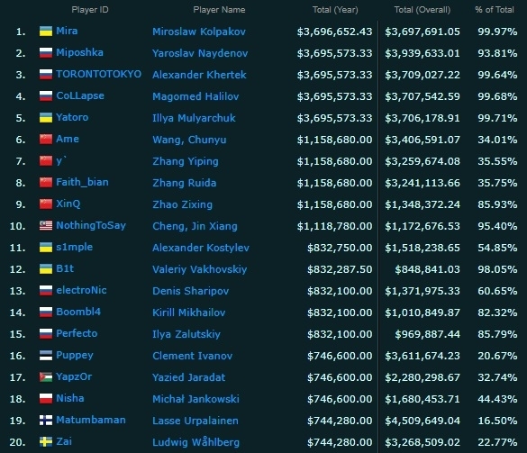 В топ-20 по количеству заработка вошли также украинские игроки состава Natus Vincere по CS:GO - Александр s1mple Костылев и Валерий B1t Ваховский. Они выиграли по 832 тысяч долларов.