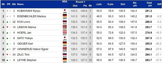 Японский прыгун Рёю Кобаяси выиграл второй этап Турне четырех трамплинов в немцком Гармиш-Партенкирхене. Он всего на 0,2 балла опередил хозяина соревнований Маркуса Айзенбихлера. Победа позволила Кобаяси также перехватить лидерство в общем зачете Кубка мира.