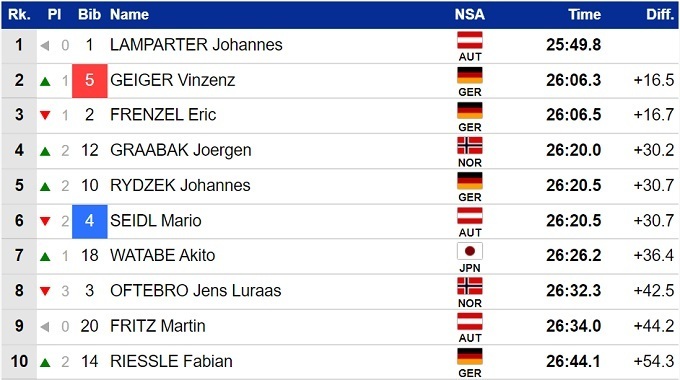 Австрийский двоеборец Йоханнес Лампартер выиграл личный старт на этапе Кубка мира в итальянском Валь ди Фьемме. Он опередил двух немцев – Винценца Гайгера и Эрика Френцеля. Лидер Кубка мира, Ярл Магнус Риибер, этап в Валь ди Фьемме пропускает.