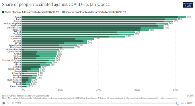 По данным портала ourworldindata.org, который предоставляет свежие данные по поводу уровня вакцинации в мире в целом, на континентах и каждой стране по отдельности, по состоянию на 5 января лишь 15% населения Африки получило вакцину от коронавируса. При этом, полностью иммунизированы оказались 9,5%, а еще 5,5% пока ограничились лишь первой дозой.