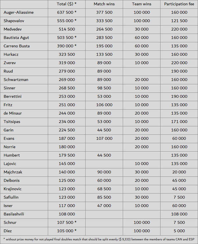 Именно лидеры канадской сборной, Феликс Оже-Альяссим и Денис Шаповалов, заработали больше всего призовых.