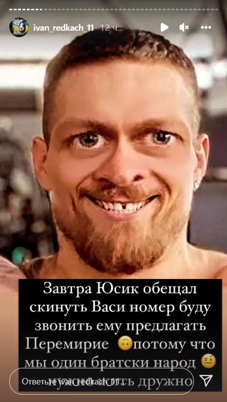 «Завтра Юсик обещал скинуть номер Васи. Буду звонить ему и предлагать перемирие, потому что мы один братский народ, нужно жить дружно», - написал Редкач в Instagram.