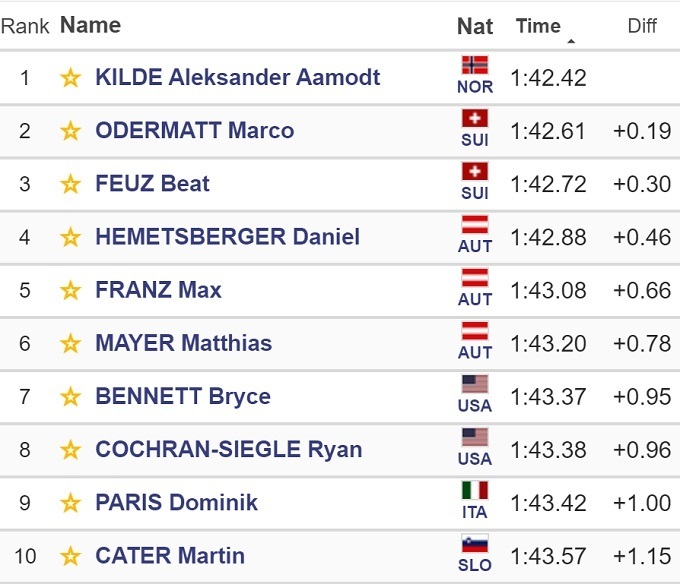 Норвежский горнолыжник Александер Омодт Килде выиграл первый скоростной спуск на этапе Кубка мира в швейцарском Венгене. Он всего на 0,19 секунды опередил победителя вчерашнего супергиганта Марко Одерматта.