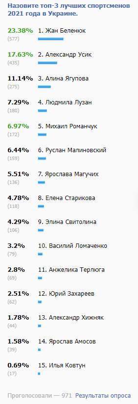 С 27 декабря по 14 января все зарегистрированные читатели Sport.ua имели возможность проголосовать за лучшего спортсмена 2021 года. Всего в опросе был отдан 971 голос.