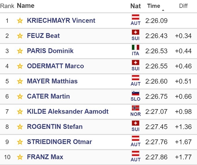 Австрийский горнолыжник Винсент Крихмайр выиграл скоростной спуск на легендарной трассе «Лауберхорн» в швейцарском Венгене. Он опередил хозяина трассы Беата Фойца и итальянца Доминика Париса.