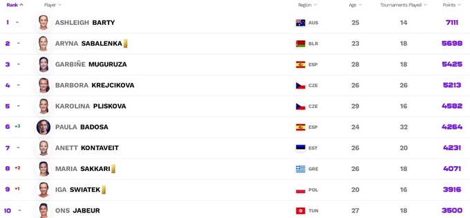 В первой десятке самого большого прогресса добилась испанка Паула Бадоса, которая поднялась сразу на две позиции и теперь занимает шестую строчку. В первой пятерке все стабильно.
