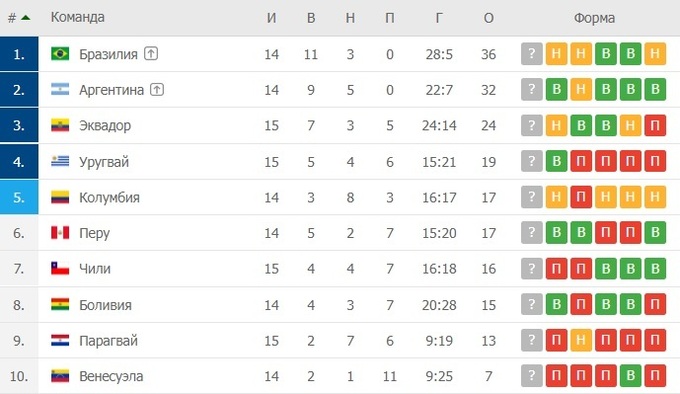 Ранее в другом матче отбора Бразилия сыграла вничью с Эквадором, а Уругвай обыграл Парагвай.
