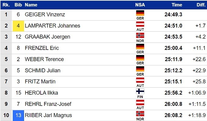 Победителю вчерашнего старта Ярлу Магнусу Рииберу сегодня не повезло с ветром во время прыжка, и в итоге он финишировал только 10-м.