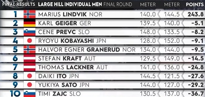 Норвежский прыгун Мариус Линдвик выиграл второй личный старт на этапе Кубка мира в немецком Виллингене. Он опередил Карла Гайгера и Цене Превца. Лидер Кубка мира и победитель вчерашнего старта, Рёю Кобаяси, финишировал четвертым, и отступил на вторую позицию в общем зачете.