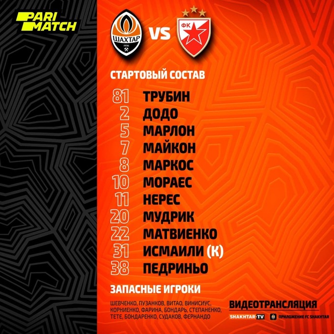 «Шахтер» (1-й тайм): Трубин – Исмаили, Матвиенко, Марлон (Бондарь, 42), Додо – Маркос Антонио, Майкон – Мудрик, Педриньо, Нерес – Мораес.