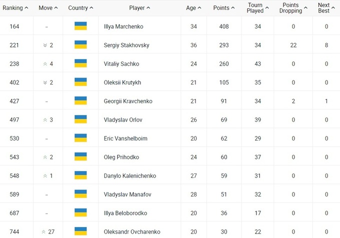 Что касается украинцев, то Илья Марченко сохранил позицию, Сергей Стаховский потерял две строчки, а Виталий Сачко поднялся на четыре места.