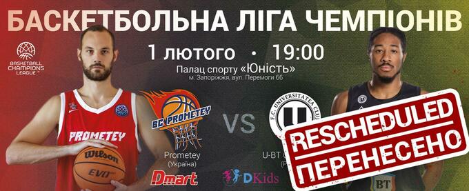 Матч второго группового этапа Лиги чемпионов по баскетболу между украинским клубом «Прометей» и румынским «Клуж-Напока», который должен был состояться уже завтра 1 февраля в Запорожье, перенесен.
