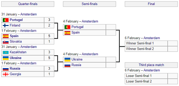 Победитель матча между Украиной и Россией в финале сыграет против Португалии или Испании.
