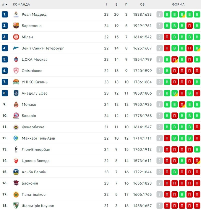 Евролига. Разгромные победы Реала и ЦСКА, Олимпиакос обыграл Басконию