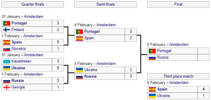 В полуфинале Евро-2022 Россия обыграла Украину (3:2), а Португалия сделала камбэк в игре с Испанией (3:2). В матче за бронзу Испания взяла верх над Украиной (4:1).
