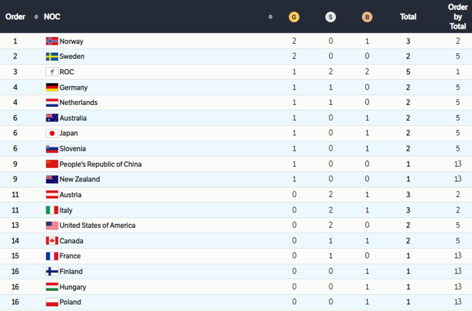 Возглавляют общий зачет Норвегия (два золотых награды и одна бронзовая) и Швеция (две золотых медали). В топ-3 также команда без гимна и флага под названием ROC (1 золото, 2 серебра, 2 бронзы).