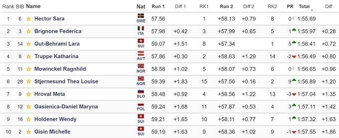 Шведская горнолыжница Сара Хектор стала олимпийской чемпионкой в гигантском слаломе. Компанию на подиуме ей составили итальянка Федерика Бриньоне и швейцарка Лара Гут.