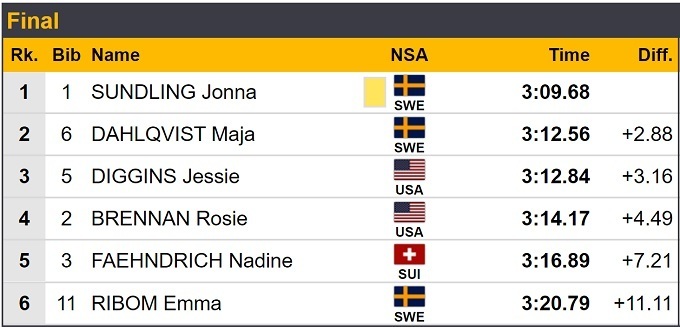 У женщин победный дубль оформила сборная Швеции: золото у Йонны Сундлинг, серебро у Майи Дальквист. Бронзу завоевала американка Джессика Диггинс.