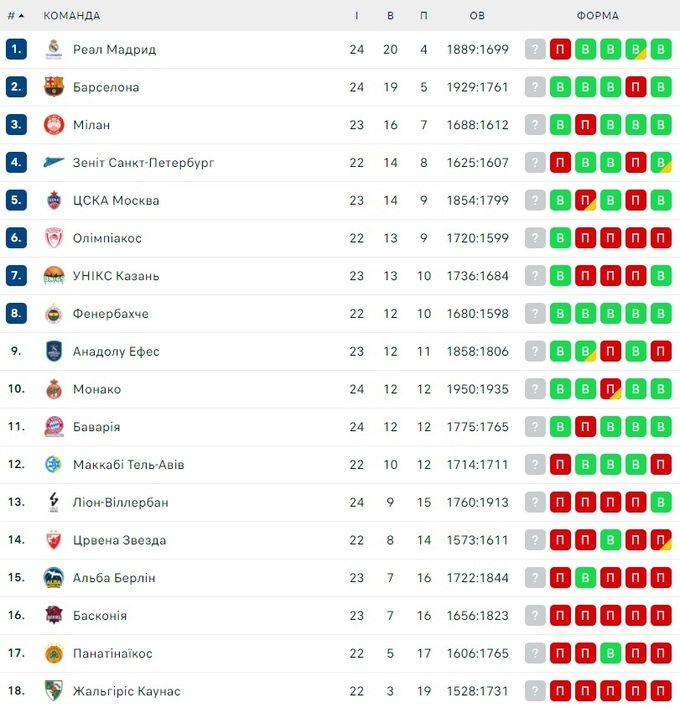 Евролига. Реал уступил Фенербахче, Милан обыграл Жальгирис