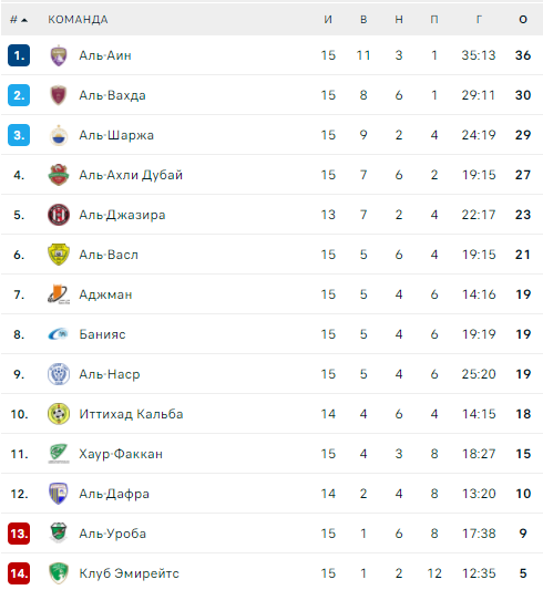 Турнирная таблица чемпионата ОАЭ на 11 февраля