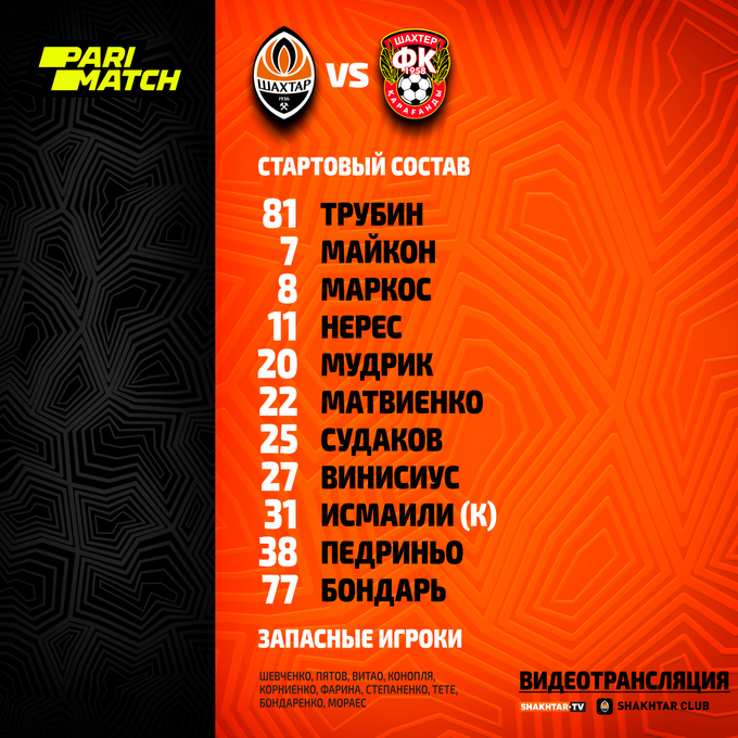 Состав «Шахтера»: Трубин, Тобиас, Бондарь, Матвиенко, Исмаили, Майкон, Маркос, Нерес, Судаков, Мудрик, Педриньо.