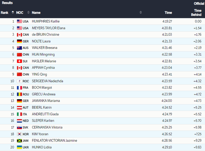 Олимпийской чемпионкой стала американка Кейли Хамфрис, серебро завоевала еще одна спортсменка из США Илана Мейерс Тэйлор, а бронза у Кристин де Брюн из Канады.