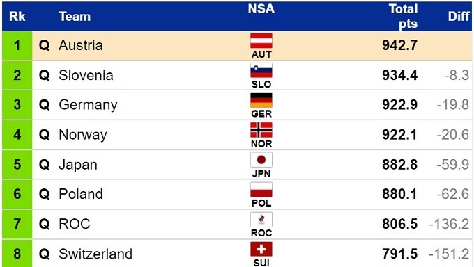 Сборная Австрии (Штефан Крафт, Даниэль Хубер, Ян Хёрль, Мануэль Феттнер) завоевала золото командного турнира в прыжках на лыжах с трамплина, опередив Словению. В борьбе за бронзу Германия оказалась сильнее Норвегии.