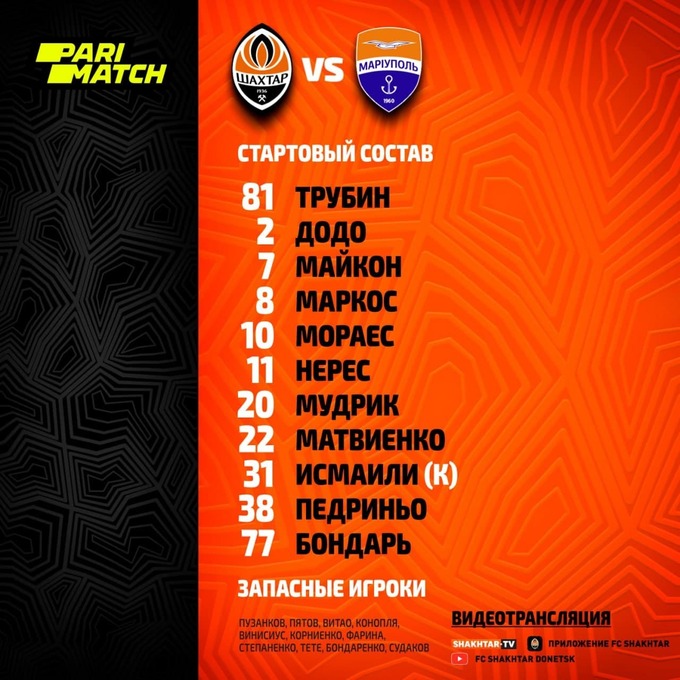 «Шахтер»: Трубин (Пятов, 31) – Исмаили (Корниенко, 31), Матвиенко, Бондарь, Додо (Винисиус, 31) – Маркос Антонио, Майкон (Степаненко, 31) – Мудрик (Судаков, 31), Педриньо, Нерес – Мораес (Тете, 31).