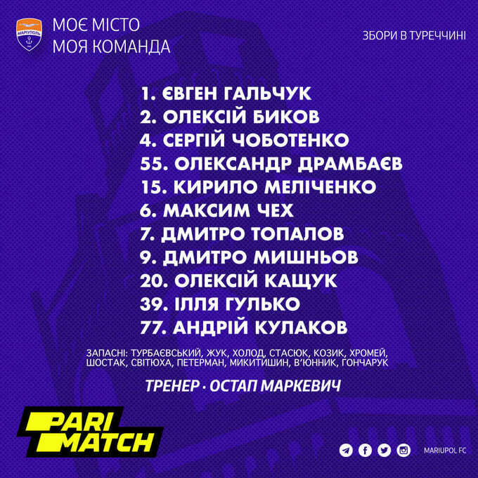 «Мариуполь»: Гальчук – Драмбаев, Быков, Чоботенко, Меличенко – Чех, Гулько – Топалов, Мишнев, Кащук – Кулаков.