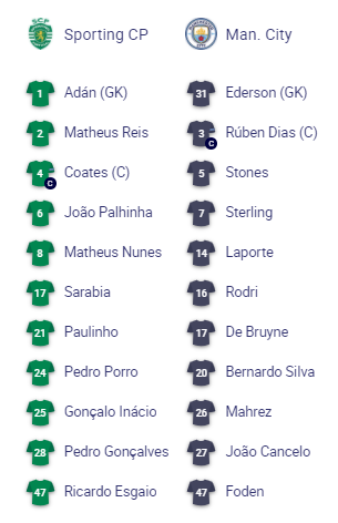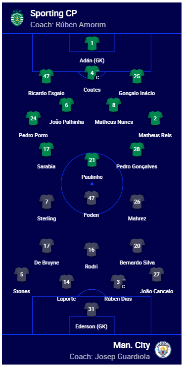Манчестер Сити: Эдерсон, Стоунз, Ляпорт, Р.Диаш, Ж.Канселу, Родри, де Брюйне, Б.Силва, Стерлинг, Марез, Фоден.