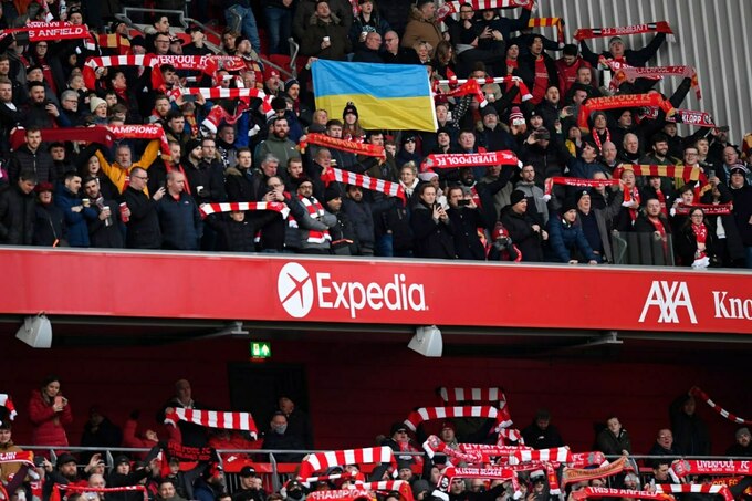 ФОТО. Фаны Ливерпуля вывесили флаг Украины во время матча АПЛ с Норвичем