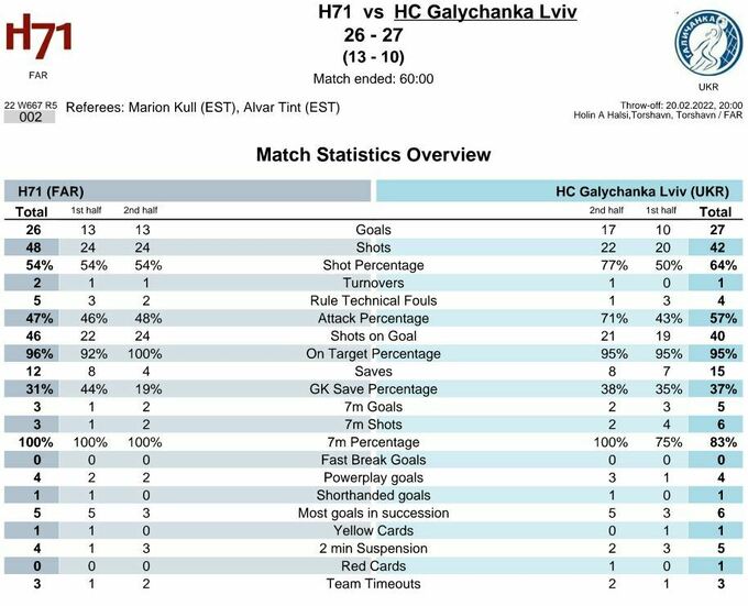 Н71 (Фарерские острова) – «Галичанка» (Украина) – 26:27 (13:10)