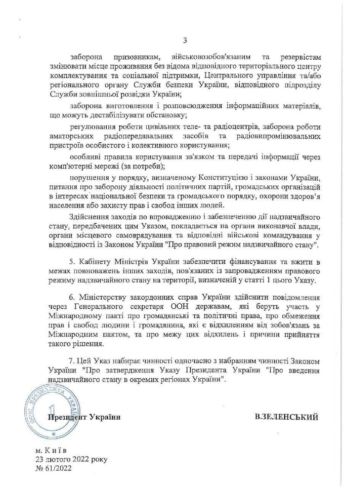 Решение принято в связи с введением чрезвычайного положения на территории Украины по причине агрессии РФ по отношению к Украине. Ратификация Указа Президента Украины ожидается сегодня вечером, 23 февраля, на внеочередном заседании Верховной Рады Украины.