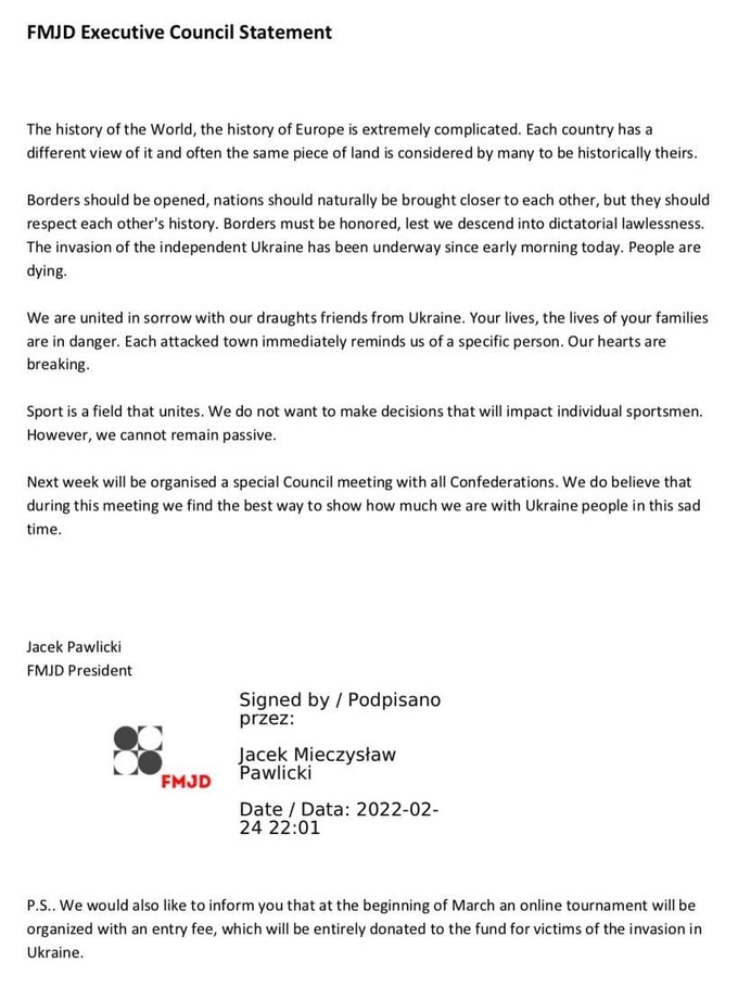 В официальном ответе президент FMJD Яцек Павлицки (Польша) выразил солидарность с Украиной и отметил, что в начале марта будет проведен благотворительный турнир онлайн, все вырученные средства от которого будут отправлены в фонд для жертв вторжения РФ в Украину.