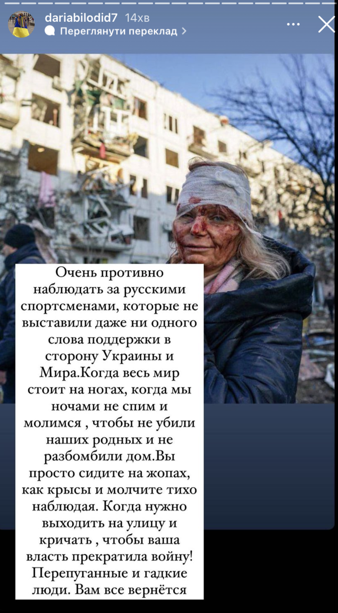 «Очень противно наблюдать за русскими спортсменами, которые не выставили ни одного слова поддержки в сторону Украины и мира. Когда весь мир стоит на ногах, когда мы ночами не спим и молимся, чтобы не убили наших родных и не разбомбили дом.