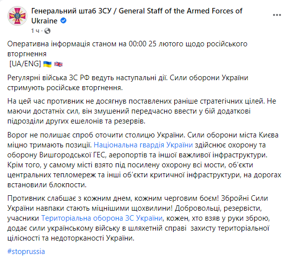 01:30. Генштаб ВСУ: Оперативная информация про российское вторжение