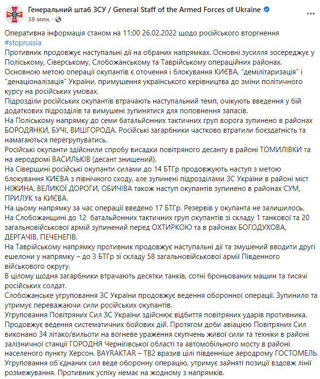В настоящее время продолжаются тяжелые бои в городе Васильков Киевской области, где оккупанты пытаются высадить десант из воздуха. На улицах Киева сейчас проходят активные боевые действия. Везде враг получает достойный отпор и несет потери. В частности, вблизи метро Берестейская уничтожена колонна 2 автомобиля, 2 грузовика с боекомплектом и танк.