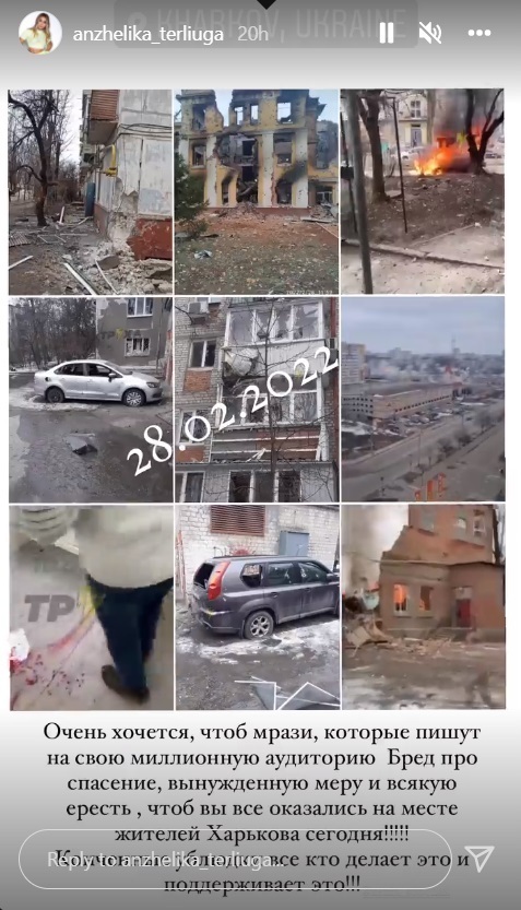 «Очень хочется, чтобы мрази, которые пишут на свою миллионную аудиторию бред про спасение, вынужденную меру и всякую ересь, чтобы вы оказались на месте жителей Харькова сегодня! Конченные ублюдки все, кто делает это и поддерживает это!».