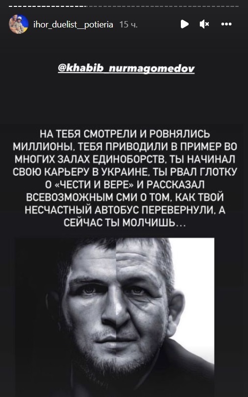 Боец Игорь Потеря (19-2) в своем Instagram призвал экс-чемпиона UFC Хабиба Нурмагомедова высказаться о нападении рашистких захватчиков на Украину.