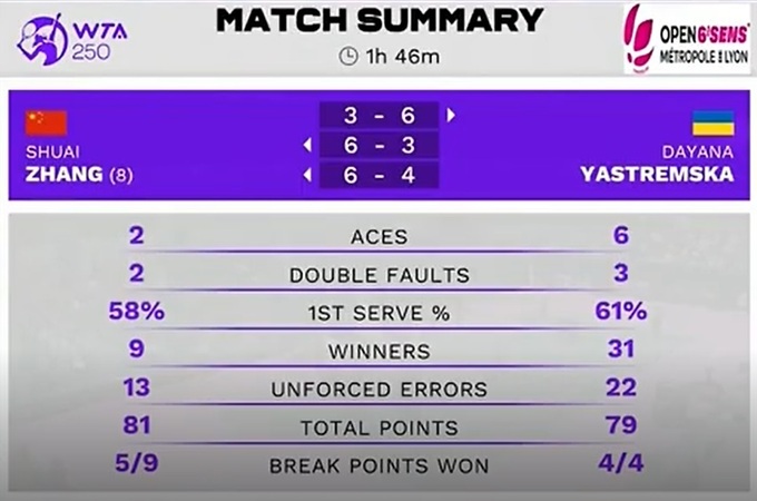 Даяна Ястремская (Украина) – Чжан Шуай (Китай) – 6:3, 3:6, 4:6