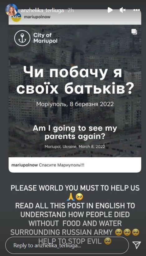 «Пожалуйста, мир, ты должен помочь нам. Прочитайте этот пост на английском чтобы понять, как люди умирают без еды и воды, окруженные российской армией. Помогите остановить зло».