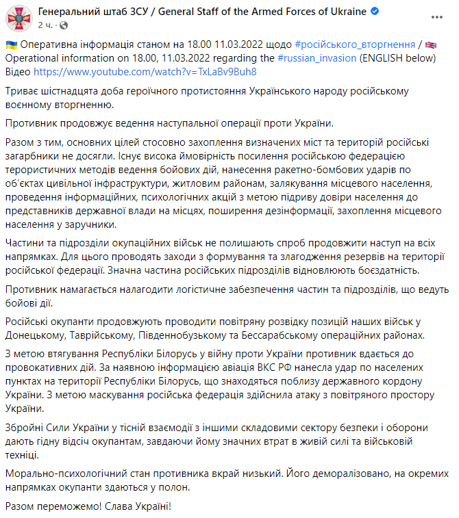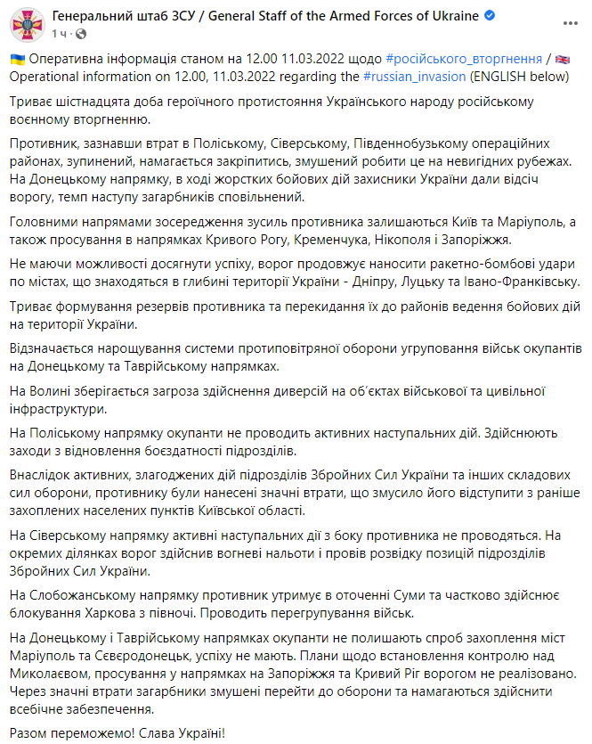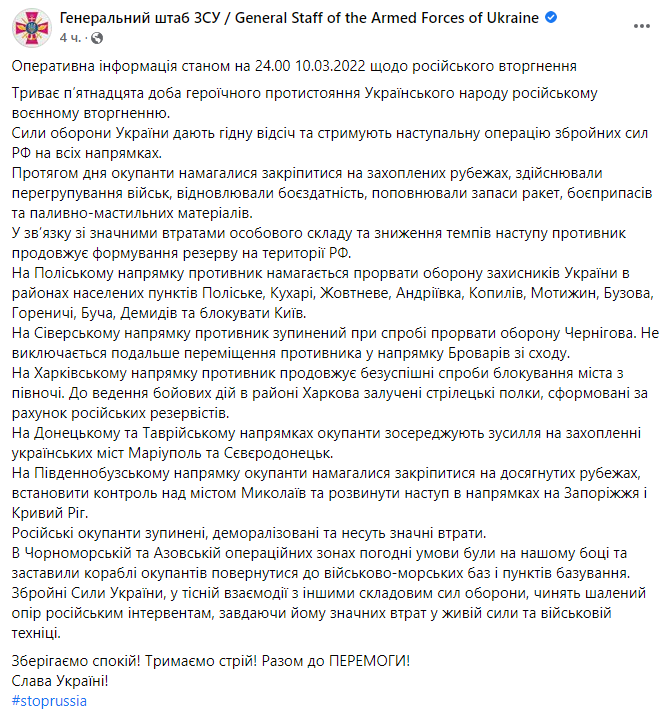 Командование Воздушных Сил ВСУ в Facebook: «10 марта бомбардировочная и штурмовая авиация Воздушных Сил при огневой поддержке вертолетов армейской авиации Сухопутных войск Вооруженных Сил Украины нанесла сокрушительный удар по двум крупным колоннам техники российских фашистских оккупантов. По предварительной информации – это полк десантных войск РФ с полным комплектом техники: танки, БМП, Грады и др.»