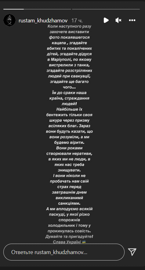 А мы аплодируем всякой паскуде, у которой резко опустел холодильник и потому проснулась совесть. Думайте и припоминайте. Слава Украине», – написал Худжамов в инстаграме.