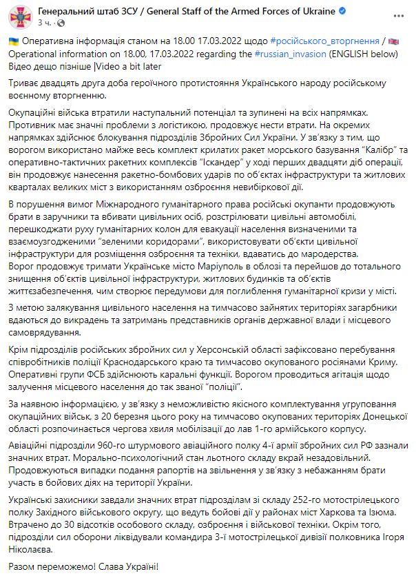 19:45. Сводка Генштаба ВС Украины