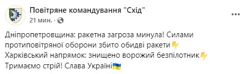14:40. В Днепре силами ПВО сбили две ракеты