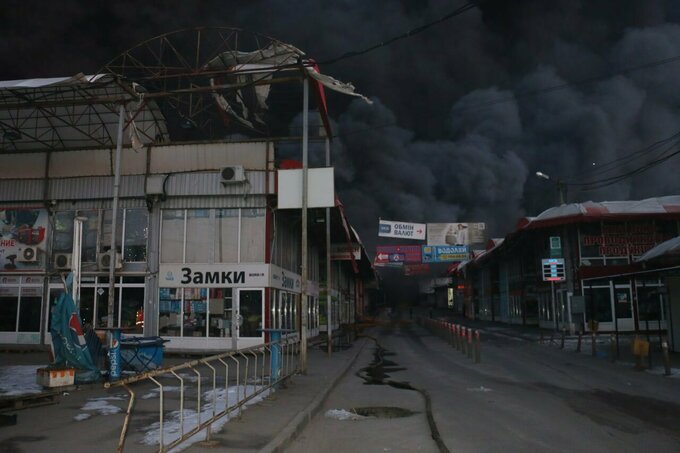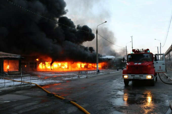 Суспільне: Пожар охватил торговые ряды. Рядом с местом пожара найдены снаряды от системы залпового огня Град, над Харьковом поднялся черный дым.